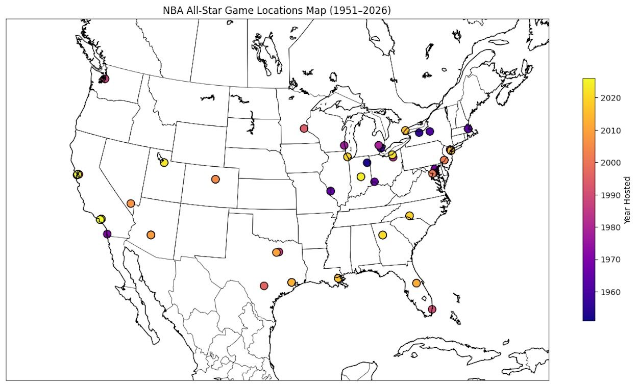 The 2026 All-Star Game adds Inglewood, California, to a long list of host cities dating back to 1951. California has played a central role in All-Star history, hosting the event across Los Angeles, Oakland, San Francisco, and now Inglewood.