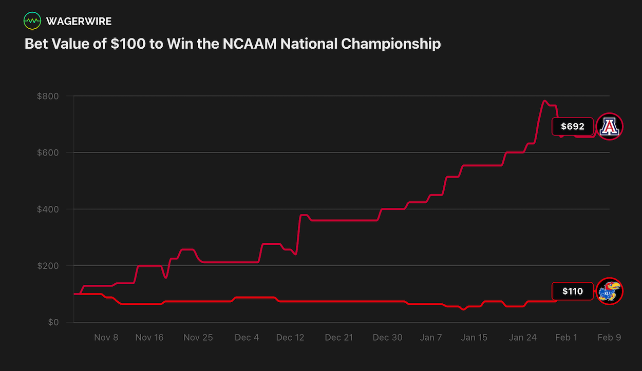 Both teams have been good this season, but Arizona is in a different class. A $100 preseason bet on FanDuel would now be worth $692, compared to just $110 for Kansas.