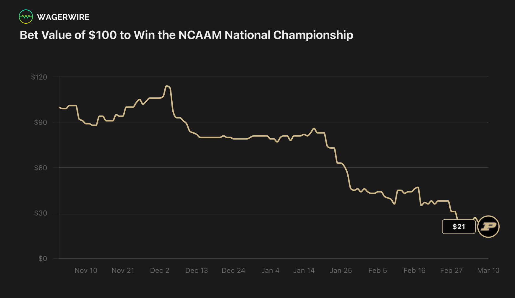 My dark horse for the tournament is the UCLA Bruins at +5000 on FanDuel. I actually like their draw a lot. They should be able to beat the winner of the Rutgers Scarlet Knights vs Minnesota Golden Gophers, and then would likely see the Michigan State Spartans, whom they’ve graded slightly worse than since February. After that, it could be the Nebraska Cornhuskers, who I think are a bit fraudulent, and, analytically, UCLA has been the better team lately. In the championship, they’d probably have to go through one of the Michigan Wolverines, Illinois Fighting Illini, or Wisconsin Badgers.