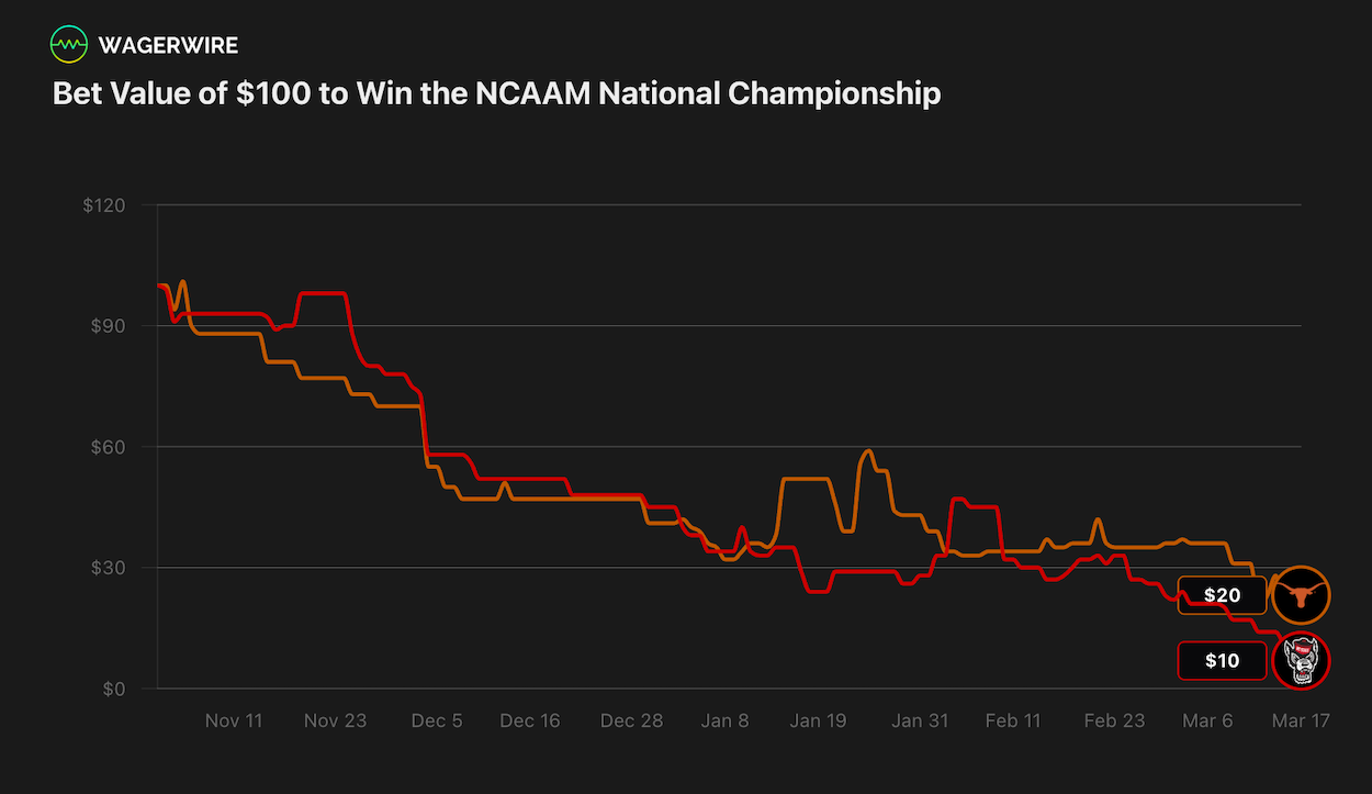 The current line on FanDuel has Texas at -111 on the moneyline with a total of 157.5. Since February 14th, neither team has been in great form, combining for a 5–11 record. That said, both offenses have remained efficient, ranking inside the top 30 over that span, while the defenses have struggled, Texas ranks 148th and NC State sits at 237th.