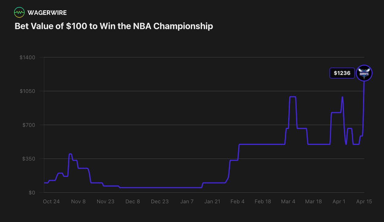 Now, the Hornets sit one game away from the playoffs and will face the loser of the matchup between the Philadelphia 76ers and the Orlando Magic for a chance to complete one of the most impressive turnarounds in recent NBA history. A $100 bet on the Charlotte Hornets at the beginning of the season on DraftKings to win the Finals is now worth $1,236.