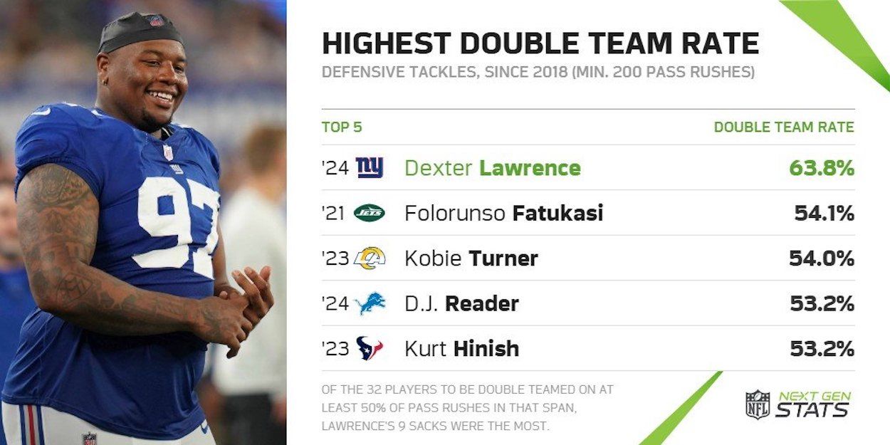 Lawrence simply didn’t perform at the level expected. The Giants’ run defense was one of the worst in the league, allowing 5.3 yards per carry, and for a player who’s supposed to anchor the interior, that’s a major red flag. Despite being double-teamed at one of the highest rates in the league, he has just 0.5 sacks over his last 22 games. Whether it’s scheme, surrounding talent, or his own play, the production hasn’t matched the reputation.