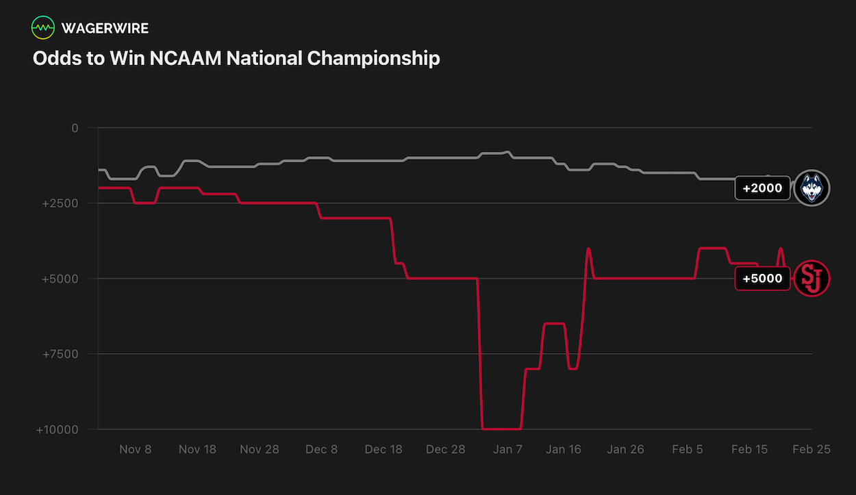 Both the UConn Huskies and the St. John's Red Storm have fallen short of FanDuel’s preseason expectations, with their futures odds being lower from their respective opening numbers as the season has progressed.
