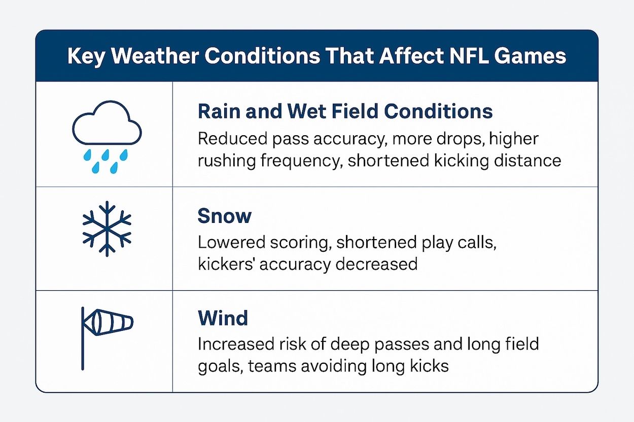 Rain, wind, heat, and snow all act as an invisible 12th man, changing how teams play. When heavy rain or wind hits, passing accuracy drops, kicking becomes unreliable, and slippery turf leads to fumbles and missed tackles. Coaches pivot to shorter passes, heavier rushing, and safer special teams calls.